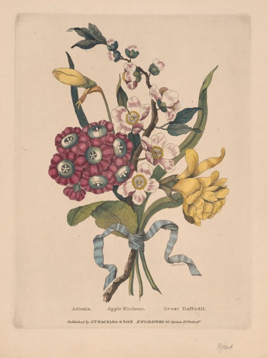 A bouquet of spring blossoms and flowers tied with a ribbon; shown are a Primula auricula cultivar, a sprig of apple blossoms, and daffodils.